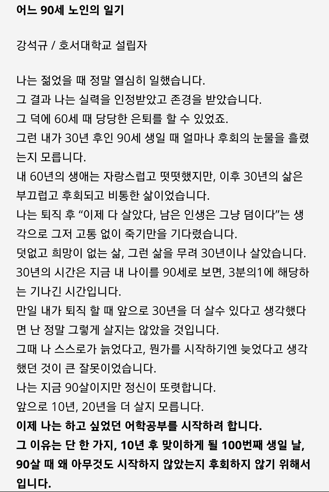 피델 : 제가 요즘 읽고 있는 책에 "90세 노인의 일기"가 나와요.. 전 선임님이 5년후에 "그때 해 볼껄" 하고 후회하지 않았으면 좋겠어요. 난 개인적으로 죽을때 "아. 그때 이거 해 볼껄" 이라는 후회가 남을거 같은 일은 우선 해 보자거든요