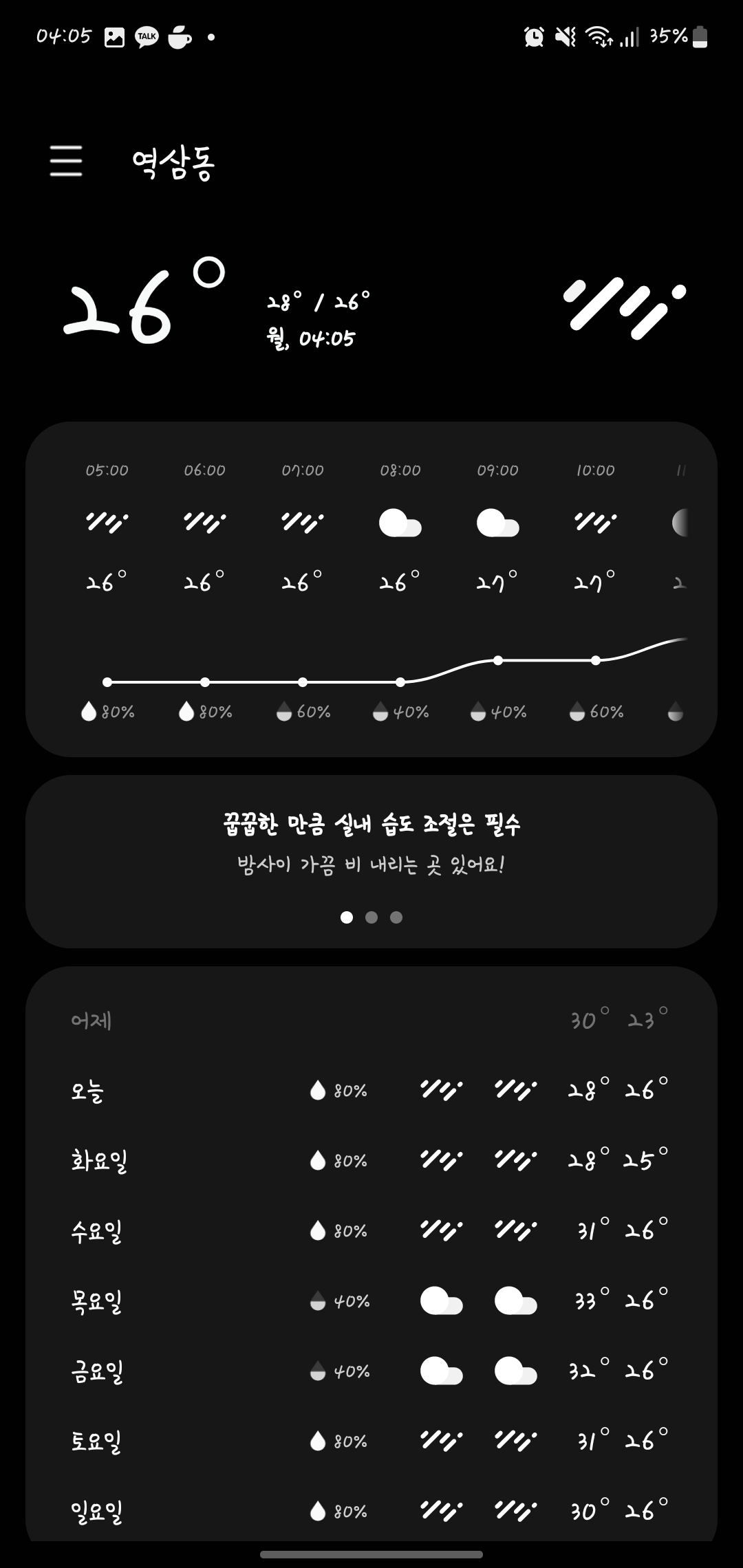 좋은 아침입니다. 이번 일주일도 비가 계속 올라나 보네요.