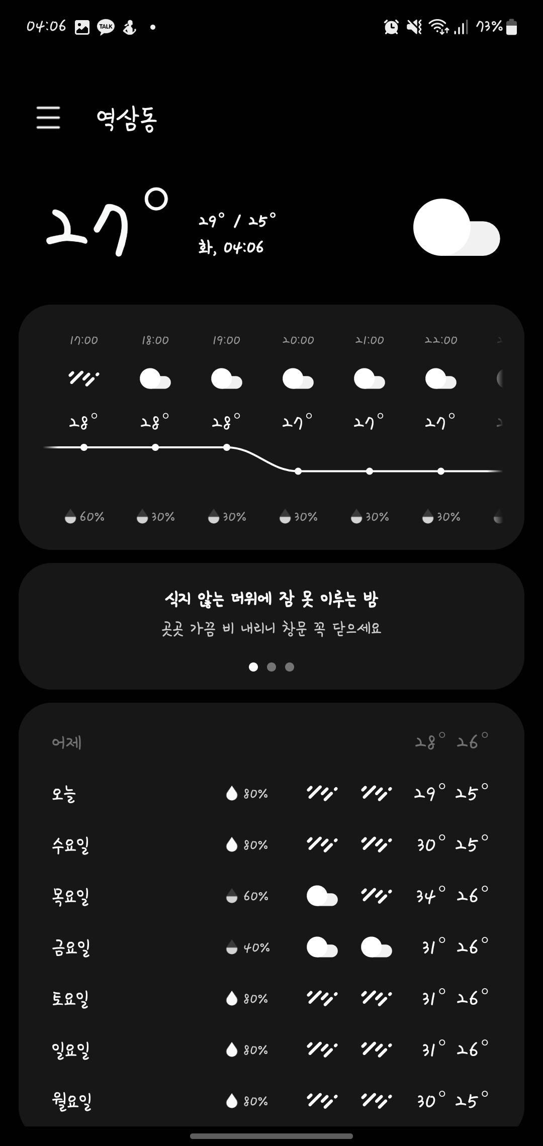 새벽에도 비가 뭔 아열대 지방 스콜처럼 내리던데