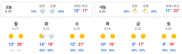 아침 기온은 꽤 높은데, 오늘 비가 오는 군요.