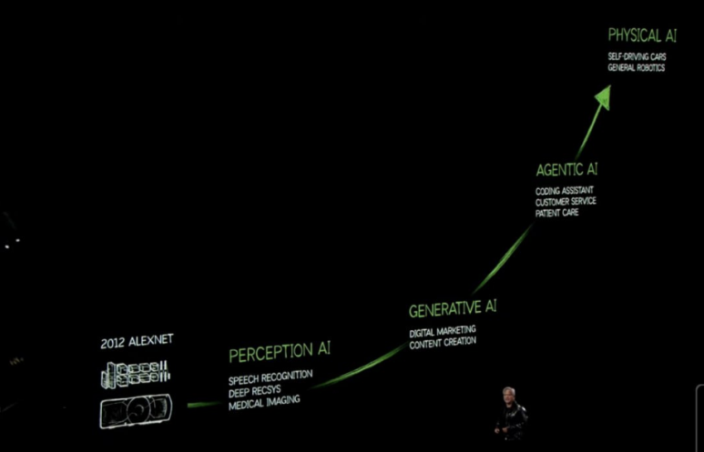 젠슨 황(NVIDIA CEO)은 AI 발전을 4단계로 구분하며, CES 2025 기조연설 등에서 이를 강조했다. 이 프레임워크는 AI가 인식에서 물리적 행동으로 진화하는 과정을 설명한다.