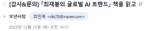| 1221. AI시대, 내가 할 수 있는 일을 빨리 시작하자. [책한조각 생각한스푼 (최재붕의 글로벌 AI 트렌드)] (0) | 2025.12.21 |