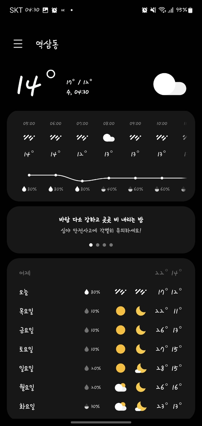 좋은 아침입니다. 오늘 다시 비가 오고 기온도 좀 떨어지네요.
