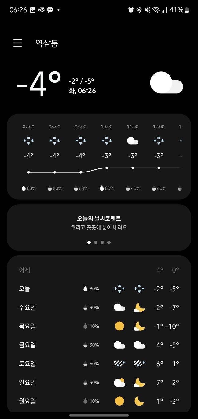 기온 예보를 보니 폭설이 있고 내일은 영하로 떨어진다길래