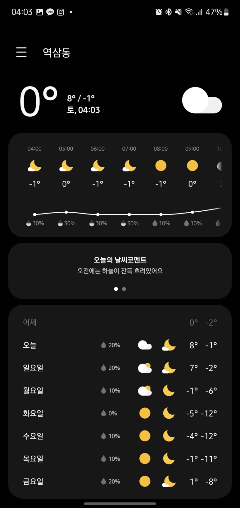 좋은 아침입니다. 오늘 날씨는 좀 풀린듯 한데. 비가오는 곳이 있다네요?