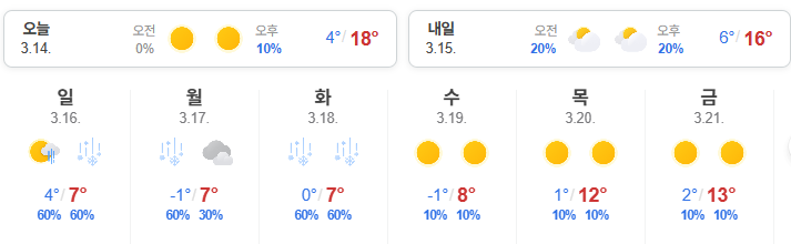 오늘은 낮에 18도까지 올라가는군요! 온연한 봄날씨가 되지 않을까 예상해 봅니다.