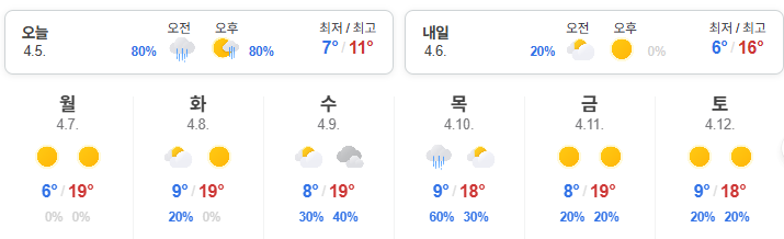어제보다 아침기온은 높지만 낮기온은 좀 낮은거 같아요.