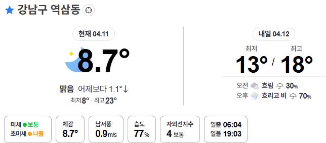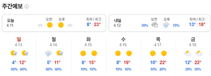 주말부터는 비가 옵니다. 기온이 약간 떨어지겠네요.